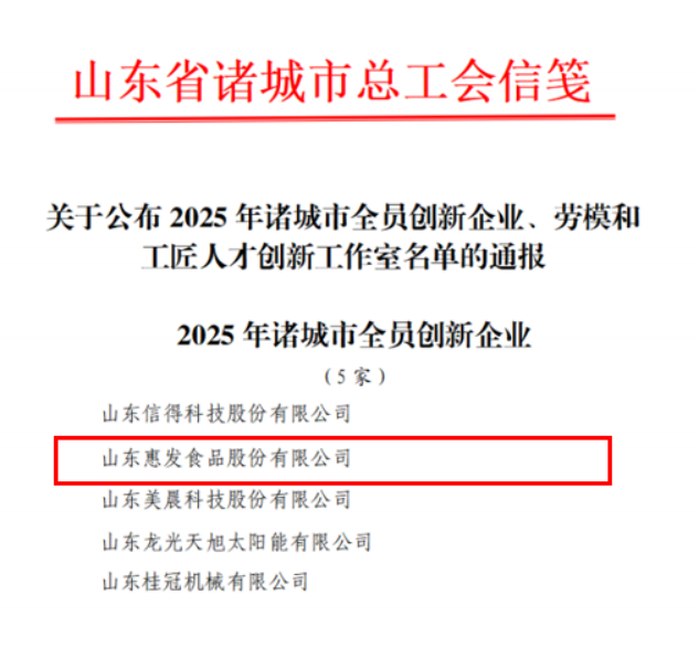 2025年8月11日,诸城市总工会下发《关于公布 2025 年诸城市全员创新企业、劳模和工匠人才创新工作室名单的通报》。山东惠发食品(603536)股份有限公司入选2025年诸城市全员创新企业。